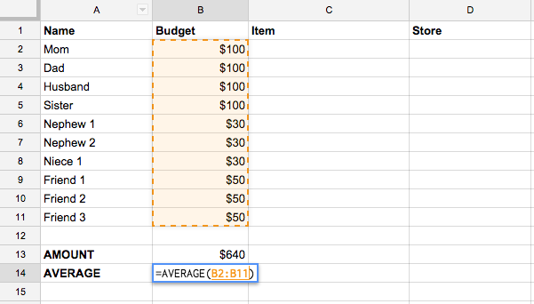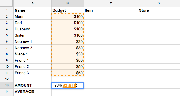Once you are in the spreadsheet, click in a range, type =SUM(, select the amount you want to sum and press enter. You can repeat the same process to check the average by typing =AVERAGE(. See it bellow: