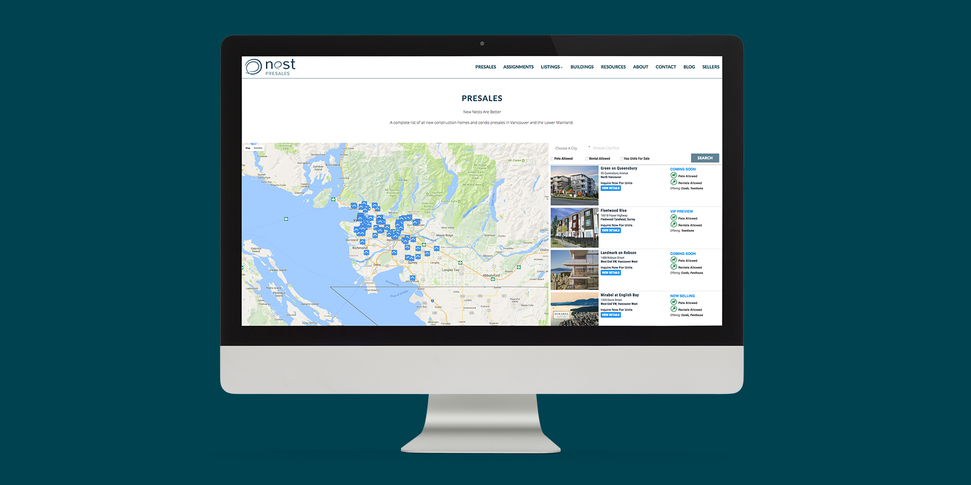 Featuring our new presales map/list hybrid search module, the website was designed to perform on Google while capturing high-quality leads from investors & buyers. Below are some samples of their Vancouver & Burnaby Presale Projects: